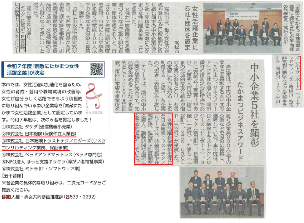 この度日本総険トラストテクノロジーズは、高松市より「素敵にたかまつ女性活躍企業」として2度目の認定を受けるとともに、令和7年度「たかまつビジネスアワード」の”働き方改革部門 女性活躍企業表彰”を受賞いたしました。